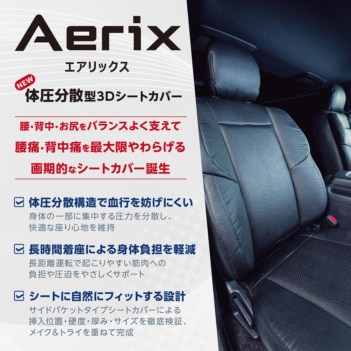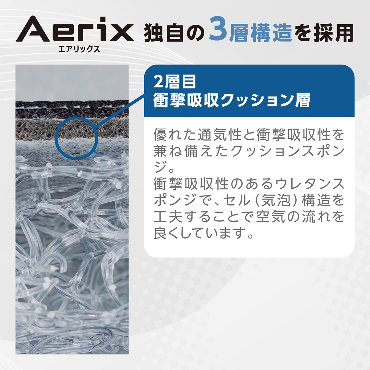 ■セル(気泡)構造の工夫で通気性と衝撃吸収性を両立したクッションをレザーと「エアリックス」の間にサンドイッチしました。